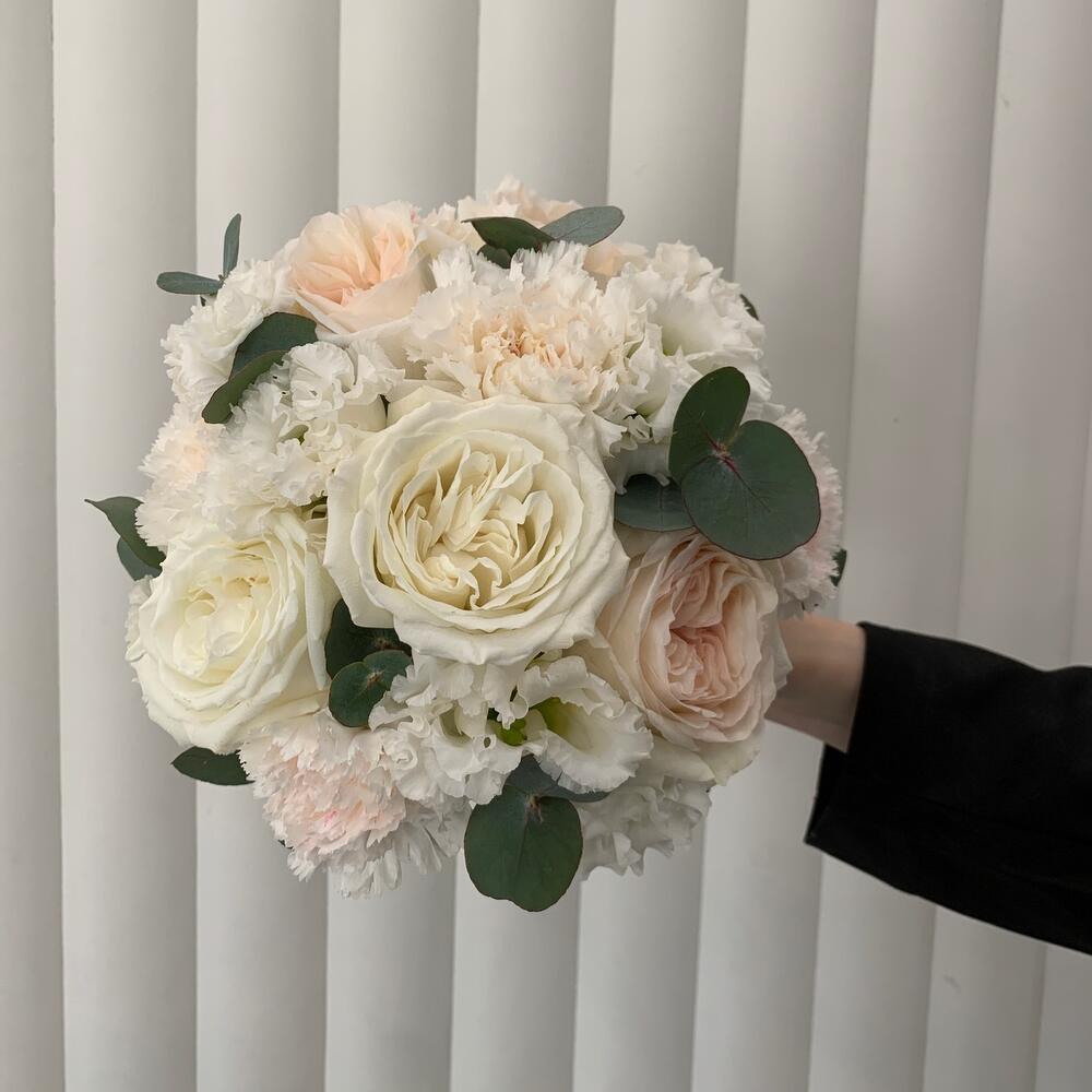 Одноголовая роза – 5 шт.Гвоздика – 7 шт.Эустома – 4 шт.