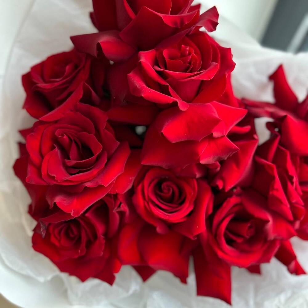 Вывернутые бархатные алые розы в белоснежной упаковке