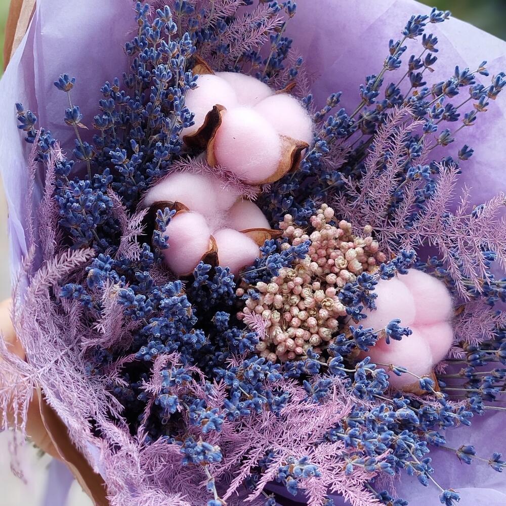 Озотамнус – 1 шт.Хлопок – 3 шт.Лента атласная – 1 шт.Упаковка дизайнерская – 1 шт.Лаванда (сухоцвет) пучок – 50 шт.Аспарагус крашенный – 2 шт.