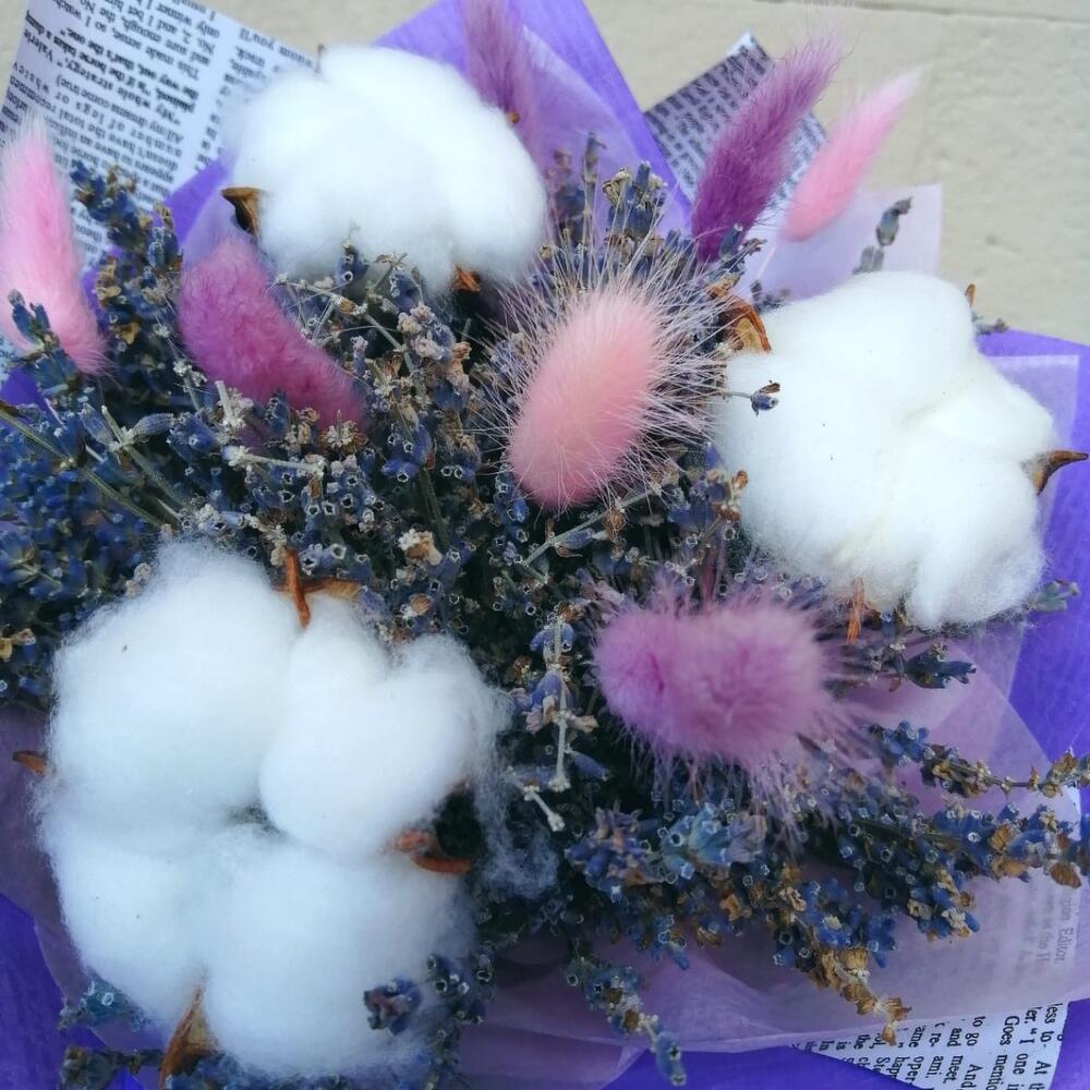 Лаванда (сухоцвет) – 50 шт.Лента – 1 шт.Упаковка – 1 шт.Лагурус – 7 шт.Хлопок натуральный – 3 шт.