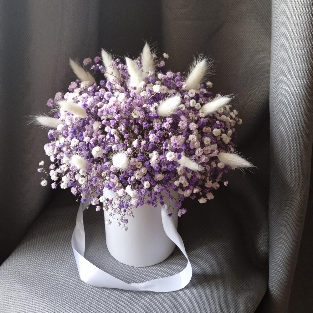 Гипсофила – 25 шт.Шляпная коробка – 1 шт.Лагурус – 15 шт.Флористическая губка – 1 шт.