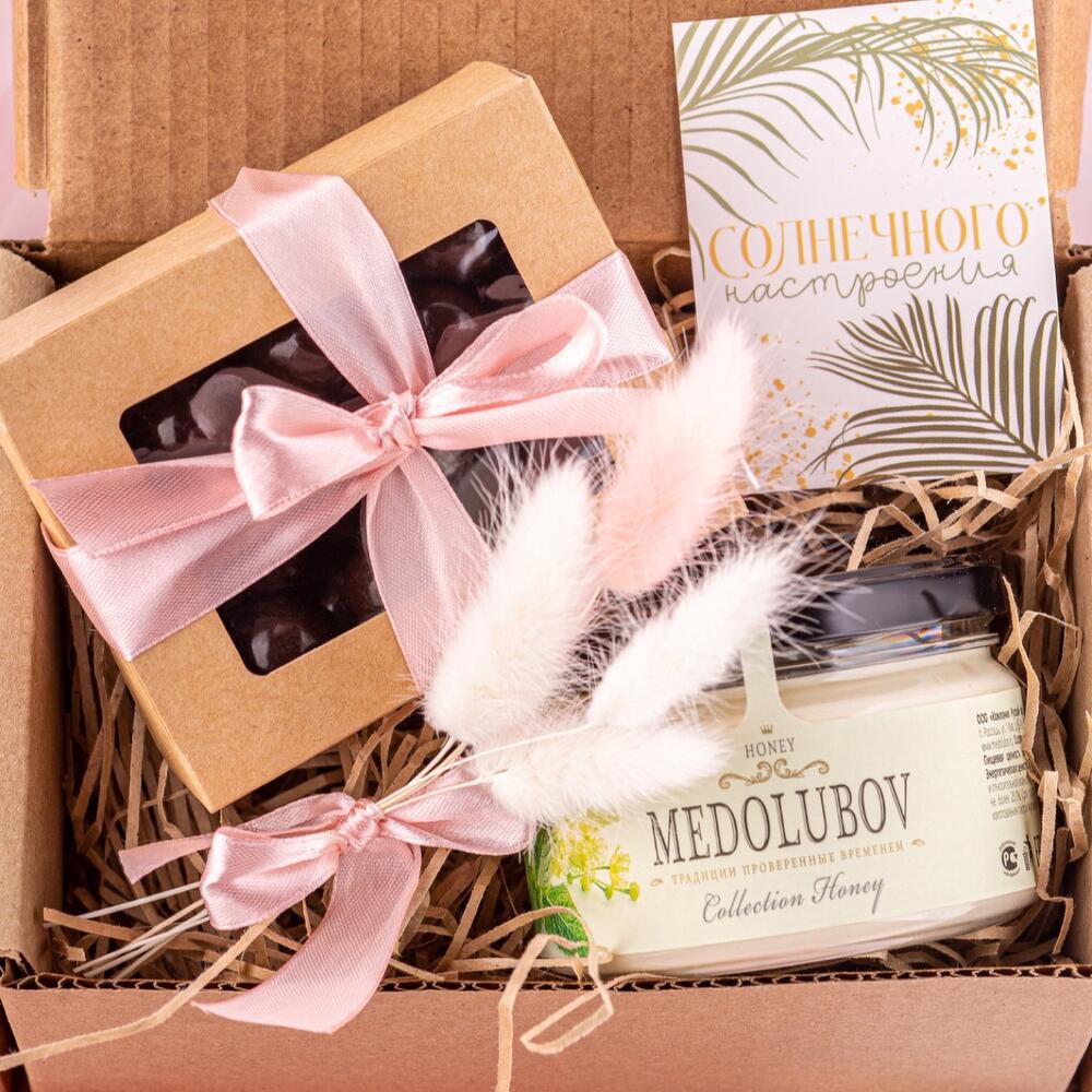 Фундук в шоколаде – 150 гр.Мини открытка – 1 шт.букетик из сухоцветов – 1 шт.мед-суфле липовый с мятой – 250 мл