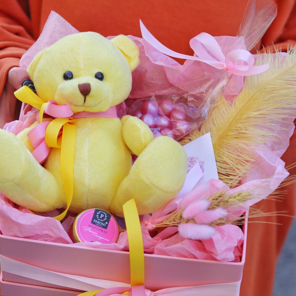 Подарочный набор “Розовый” с мишкой, свечей, сладостями, открыткой и сухоцветами