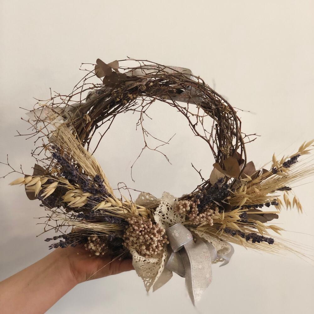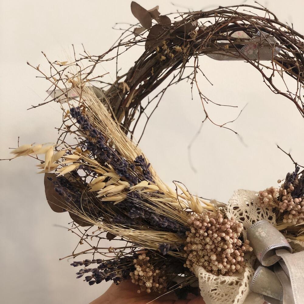 Основа для венка – 1 шт.букет из сухоцветов микс – 2 шт.Лента хлопок – 3 шт.Лаванда (сухоцвет) пучок – 1 шт.Озотамнус – 3 шт.