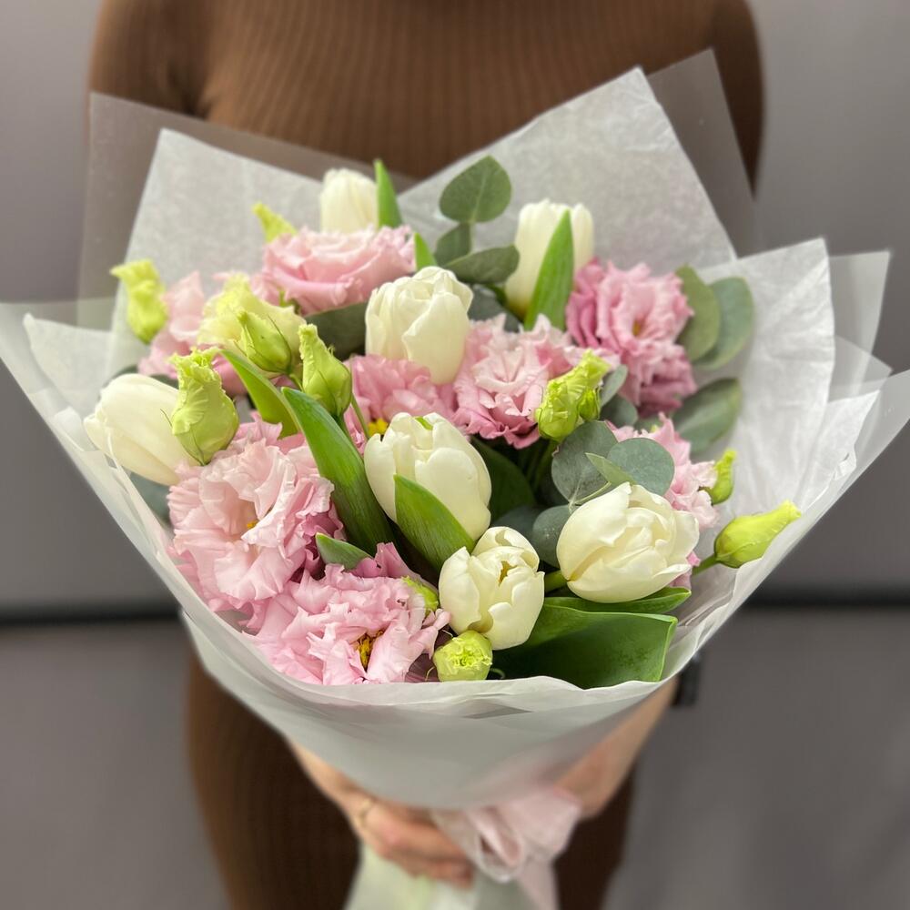 Тюльпан белый – 7 шт.эустома розовая махровая – 3 шт.Эвкалипт – 1 шт.Тишью – 1 шт.Пленка матовая – 2 шт.Лента атласная – 2 шт.