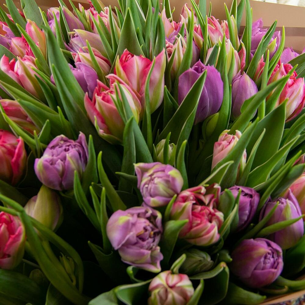 Букет из 35 тюльпанов пионовидных микс в дизайнерской упаковке