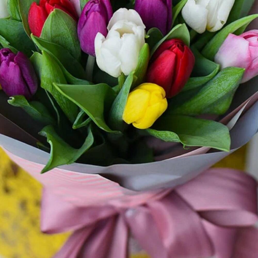 Лента атласная – 1 шт.Упаковка дизайнерская – 3 шт.тюльпаны микс – 15 шт.