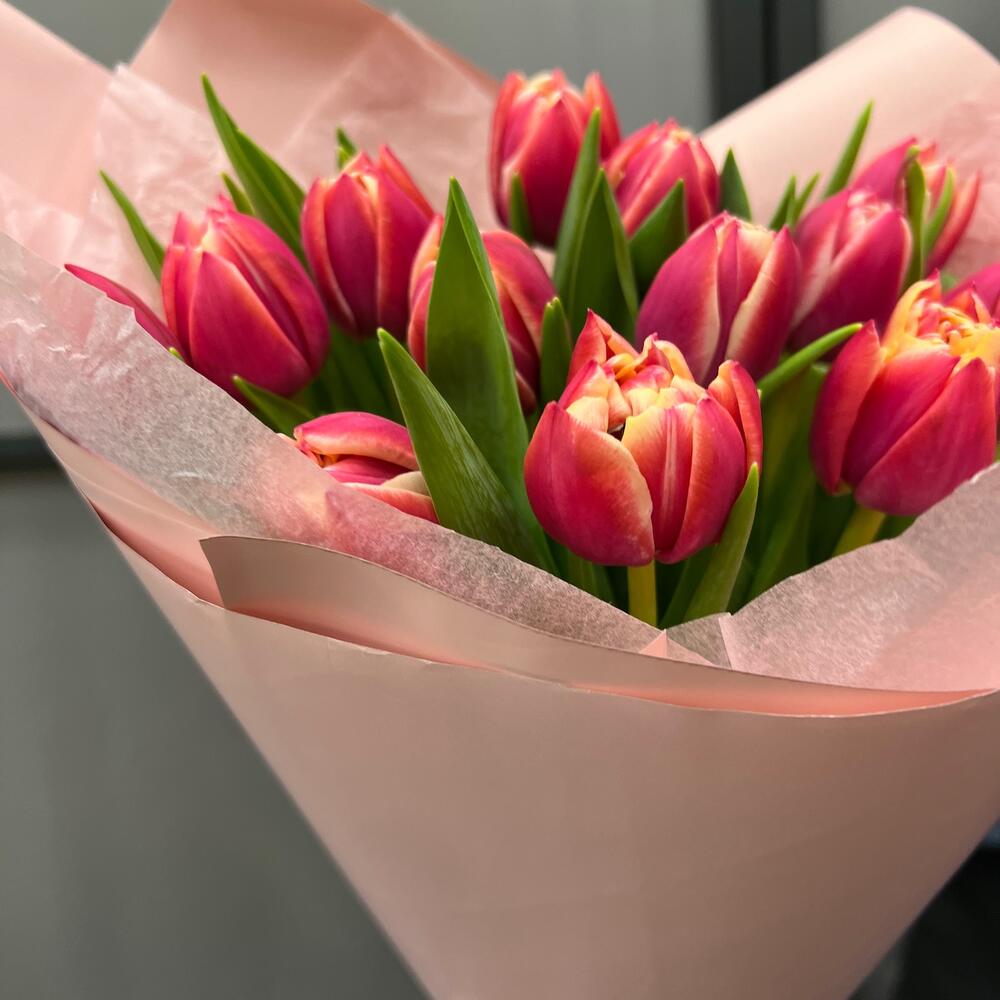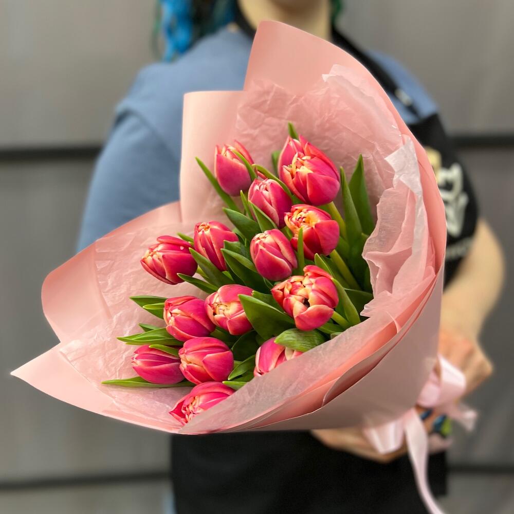 Тюльпан пионовидный – 15 шт.Тишью – 2 шт.Пленка матовая – 2 шт.Лента атласная – 2 шт.