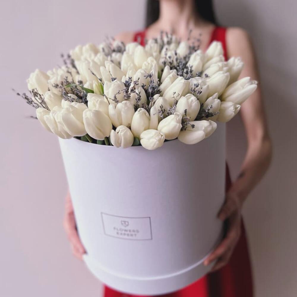 Тюльпан белый – 101 шт.Лаванда – 1 шт.Коробка шляпная – 1 шт.