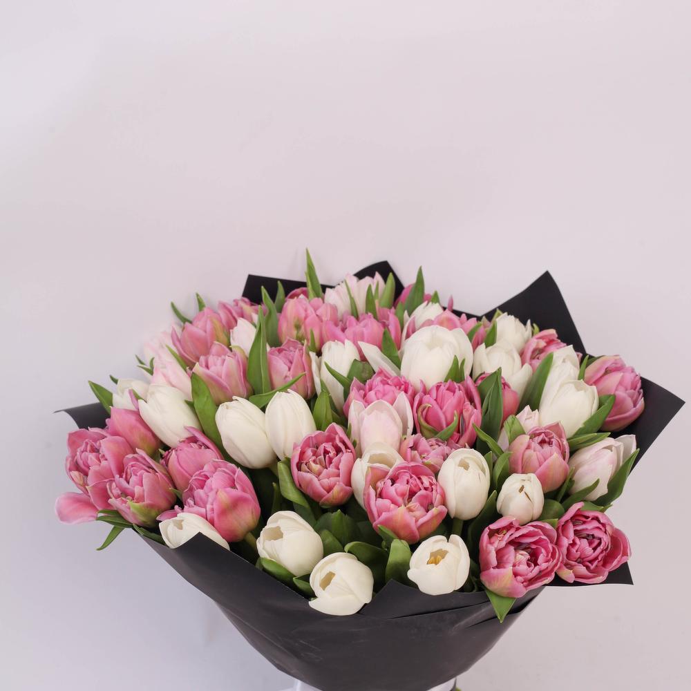 Тюльпан пионовидный дабл прайс – 26 шт.Пленка дизайнерская – 1 шт.Сердце – 1 шт.Тюльпан белый (голландия) – 25 шт.