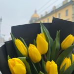 Лента атласная – 1 шт.Тюльпан желтый – 9 шт.Упаковка корейская пленка – 1 шт.