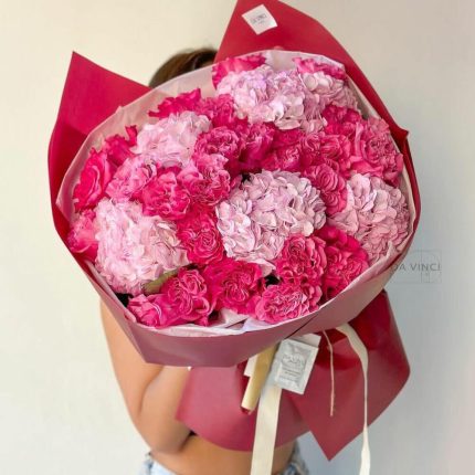Бархатный цилиндр из голубых диантусов, розовых пионов и ароматной маттиолы
