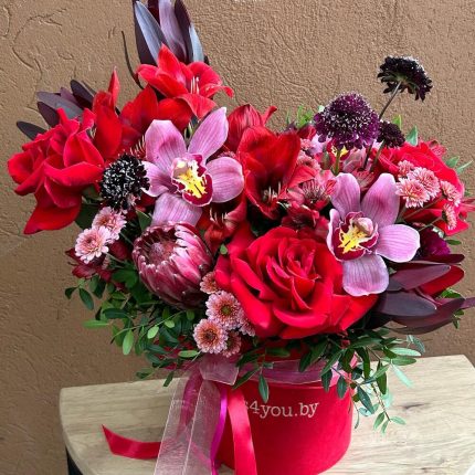 Цветы в коробке с ирисами,тюльпанами, розами,эустомой,хлопком и ягодами вибурнума